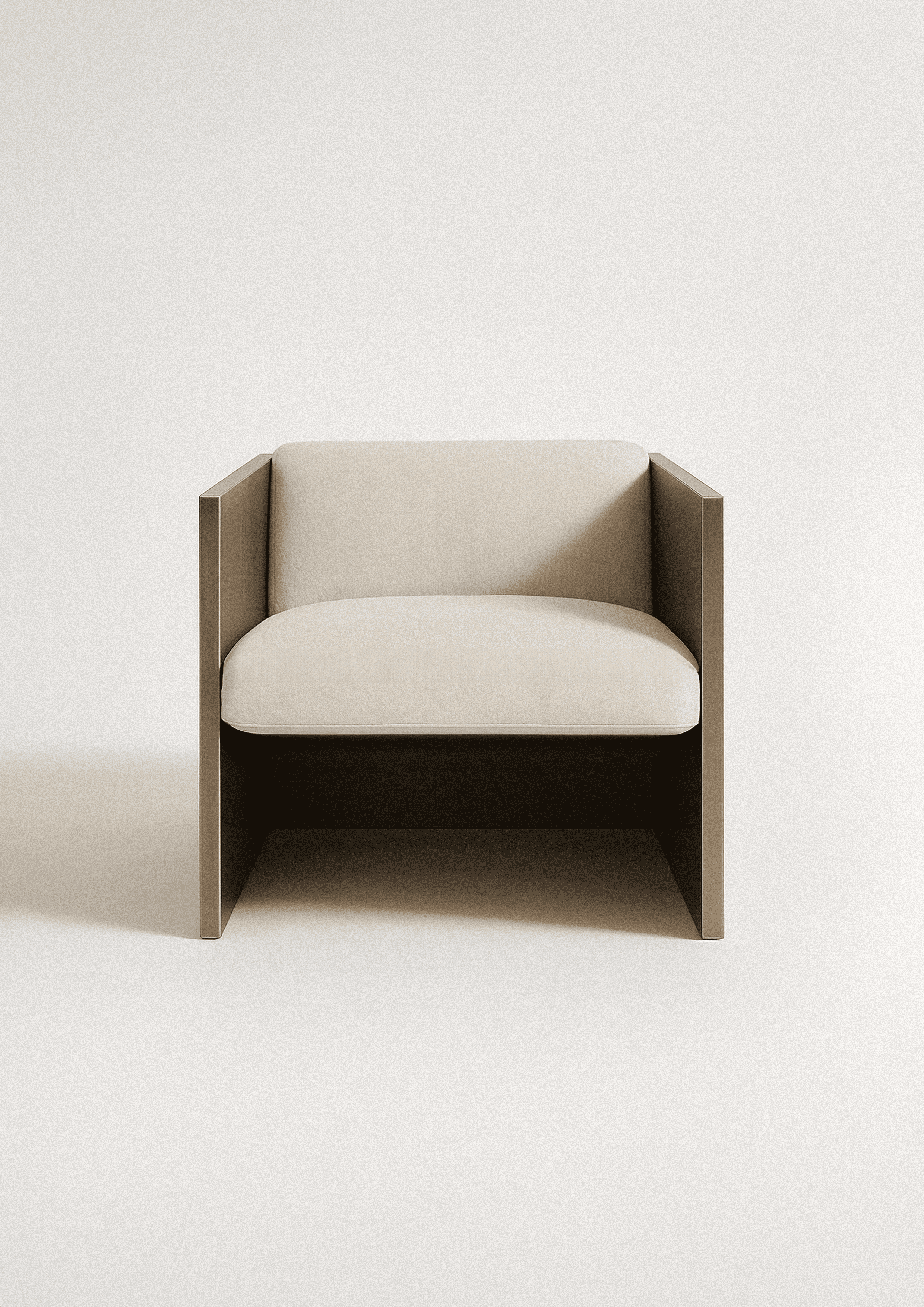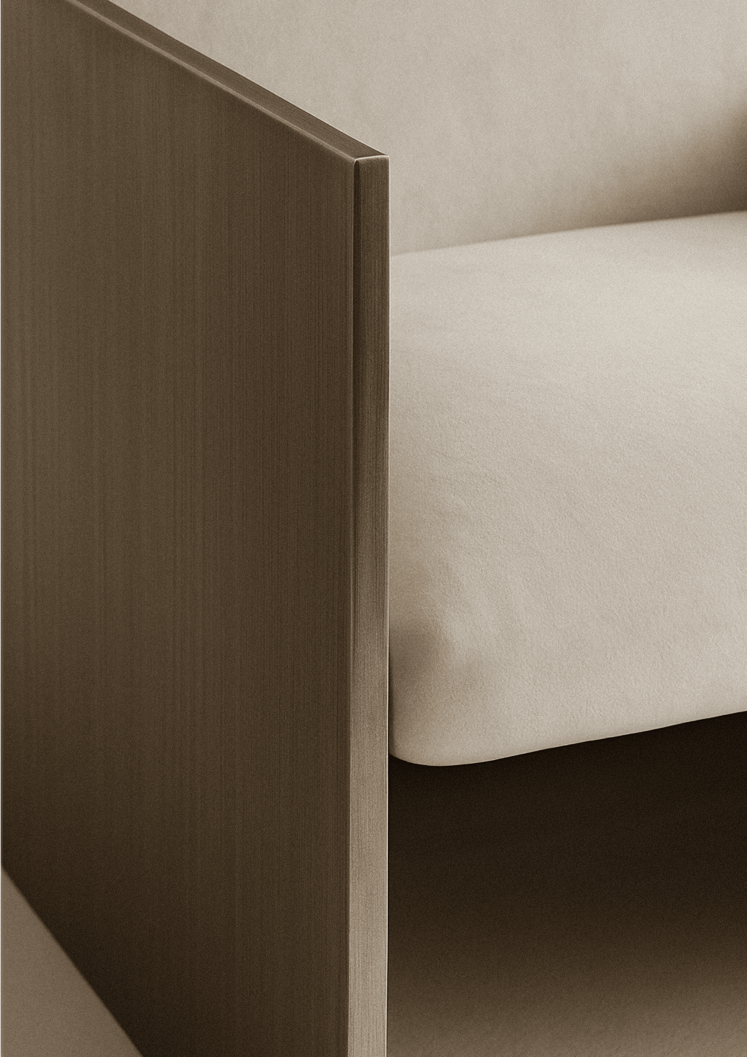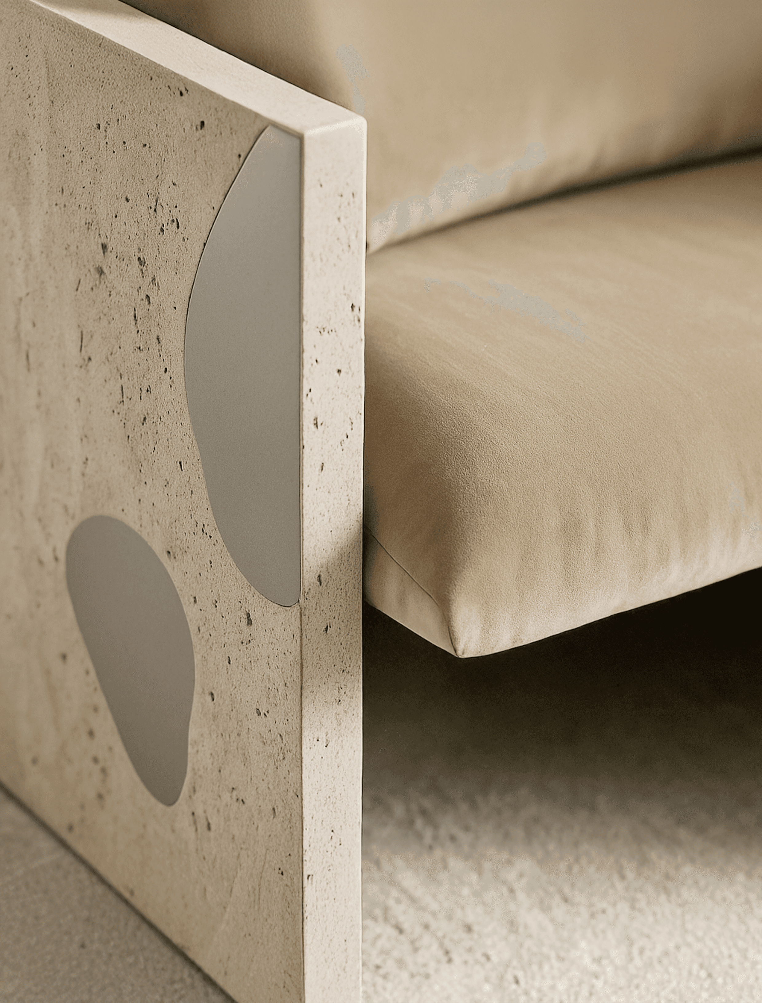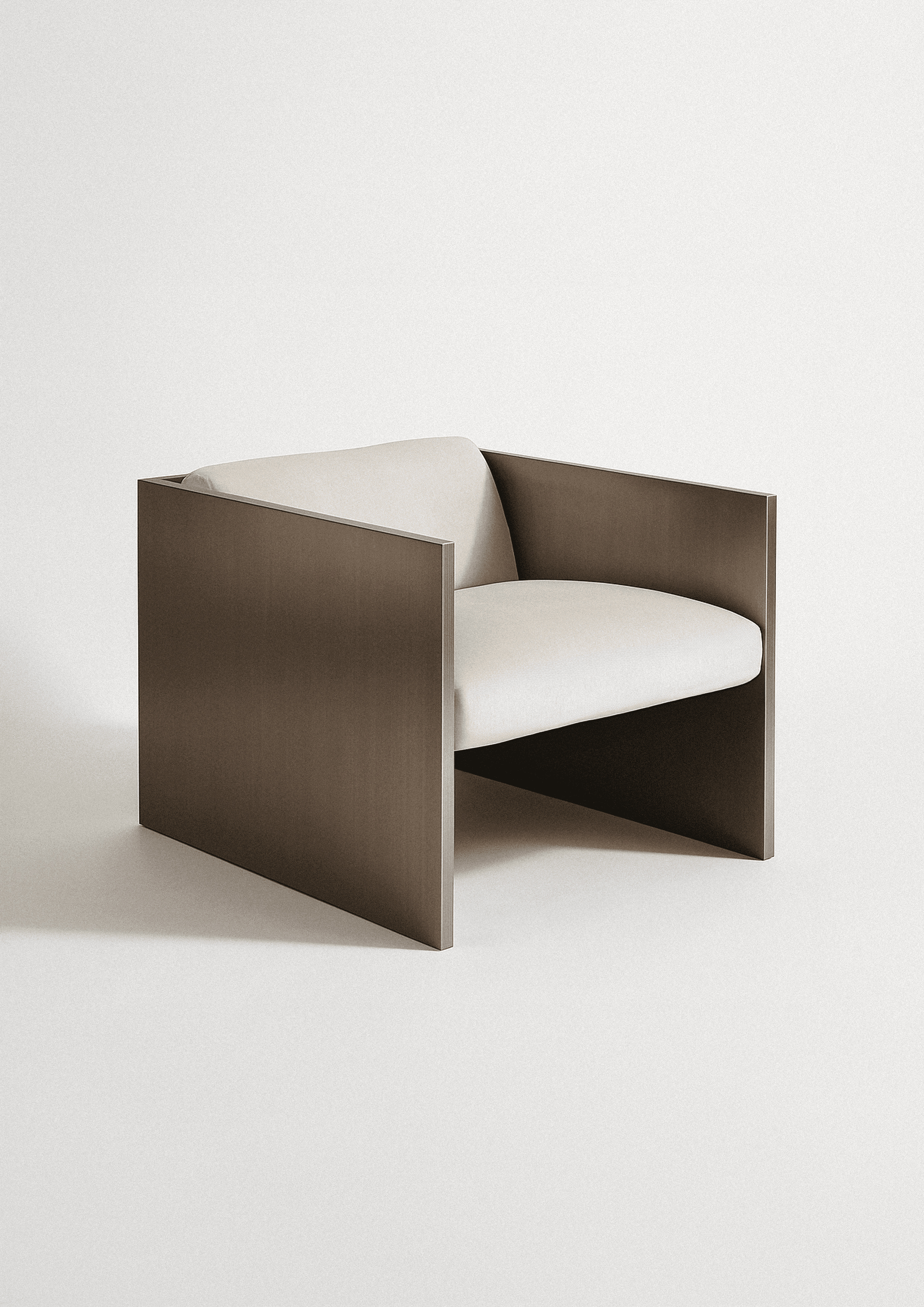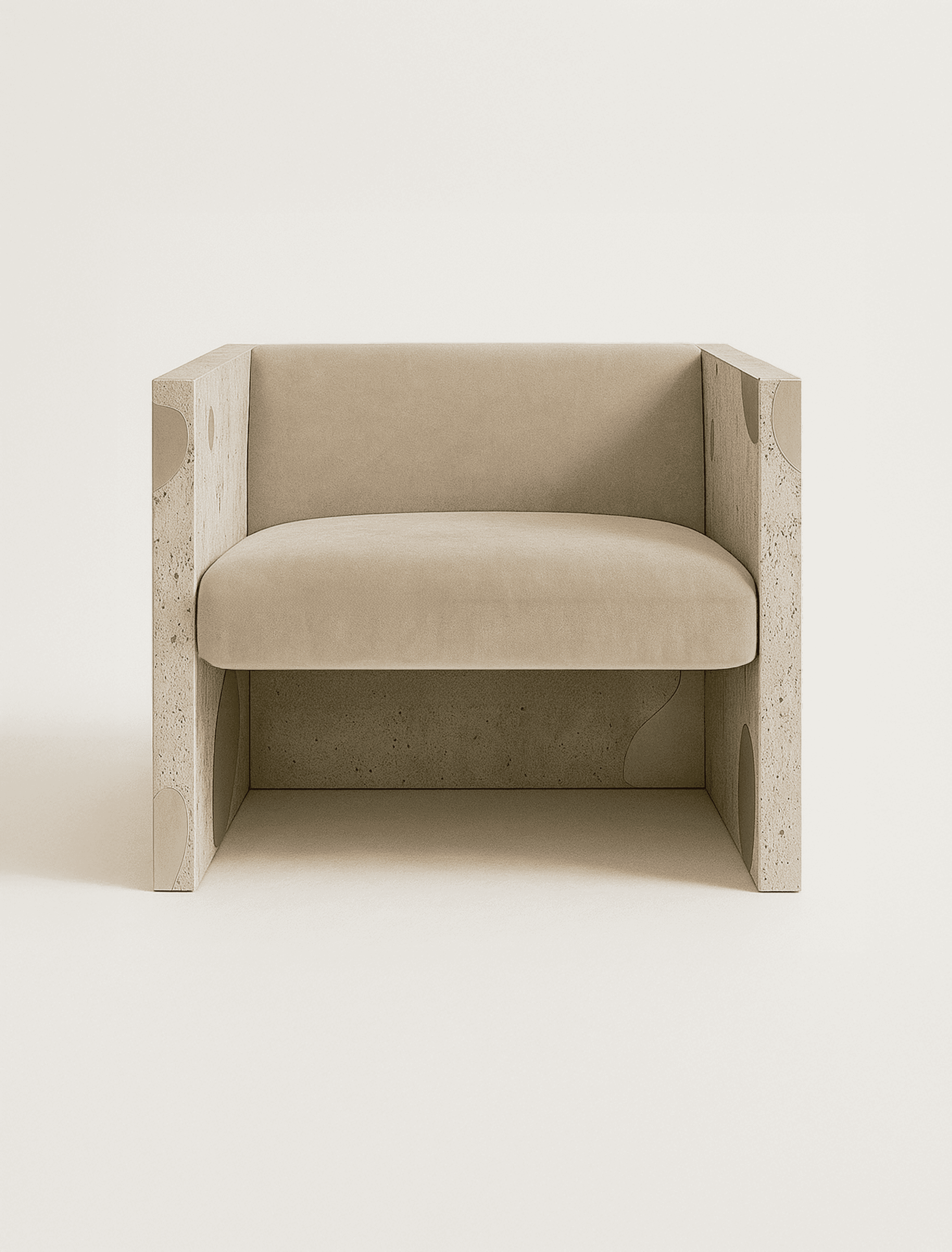 Crafted for Nove Studio’s coastal atelier, the Cava armchairs fuse geological expression with architectural precision. Each piece is constructed using CNC-cut solid stone panels—one in honed travertine with cast aluminum inlays, the other in a matte bronze-coated aluminum alloy. These forms are precision-joined with concealed dowels to preserve their monolithic geometry, allowing the material character to remain uninterrupted.
