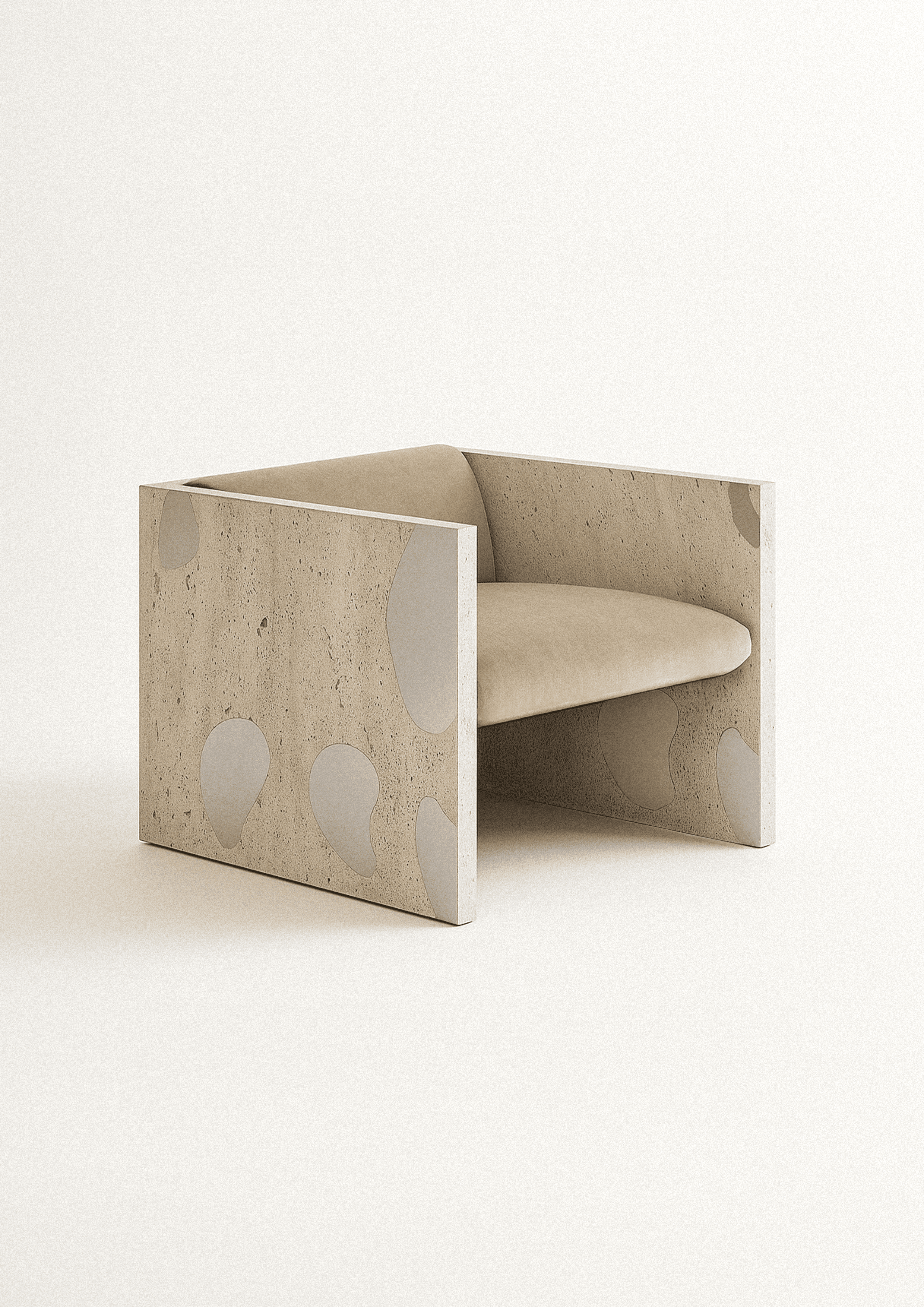 Cava I features a hybrid composition of natural travertine and molten-cast aluminum, seamlessly embedded to create an organic surface pattern reminiscent of erosion and sedimentary layering. The aluminum is poured into pre-carved cavities and ground flush, achieving a tactile dialogue between mineral density and metallic sheen. The result is both sculptural and structural—a chair that acts as a visual anchor in space.